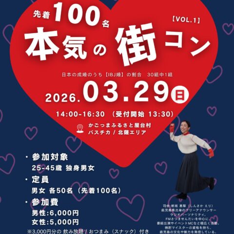 かごっまふるさと屋台村(バスチカエリア)において、 最大100名(男性50名&女性50名)のパー…