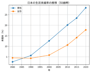 【日本の生涯未婚率(50歳時)】出典:国立社会保障・人口問題研究所「出生動向基本調査」